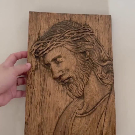 Handcrafted wooden carved wall plaque Jesus wearing the crown of Thorns